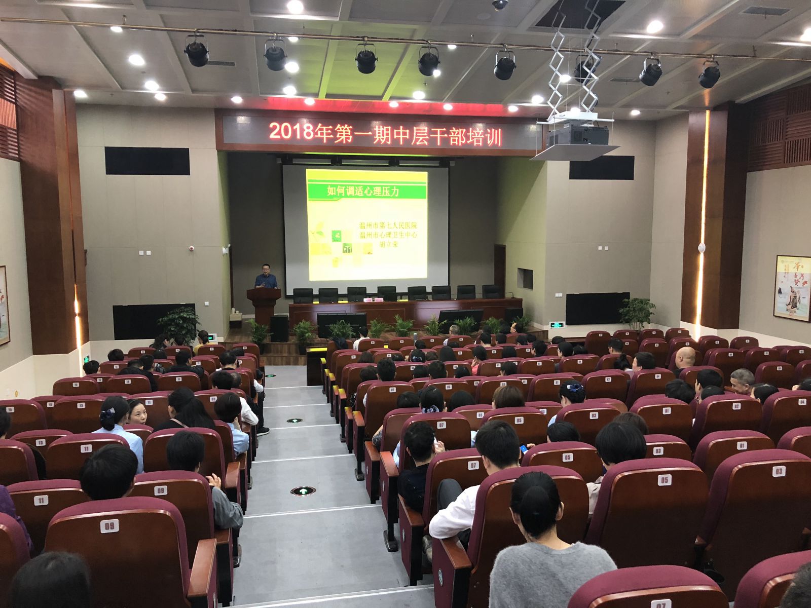 我院举办2018年第一期中层干部培训4月13日,我院2018年第一期中层干部培训在综合楼八楼报告厅举行,100余名中层干部参加了此次培训。 为了充分发挥干部的积极性、主动性、创造性,关爱干部的身心健康,此次培训特邀温州市第七人民医院胡立荣主任医…查看详情+