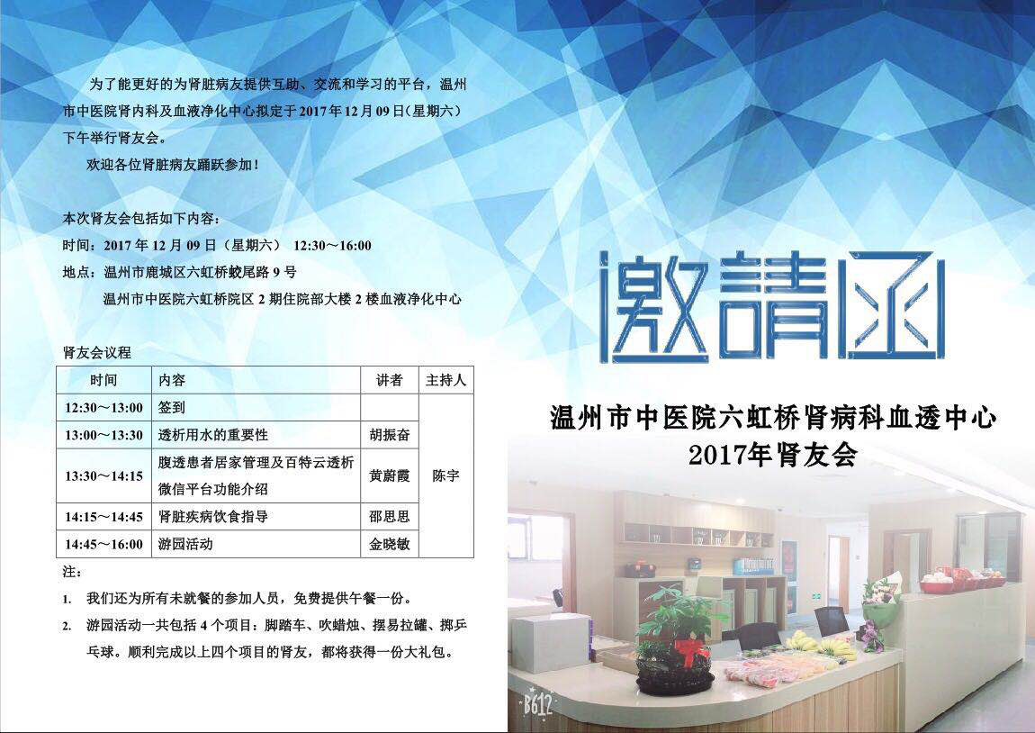 2017年小妲己直播 肾病科血透中心肾友会成功召开2017年12月9日下午,小妲己直播 六虹桥肾病科血透中心2017年肾友会在二期住院部大楼二楼隆重召开。患者、家属及科室医护人员欢聚一堂,虽然是寒冬季节,会场却是暖意融融。从签到入场到领位入座,主任、护士长都做了…查看详情+