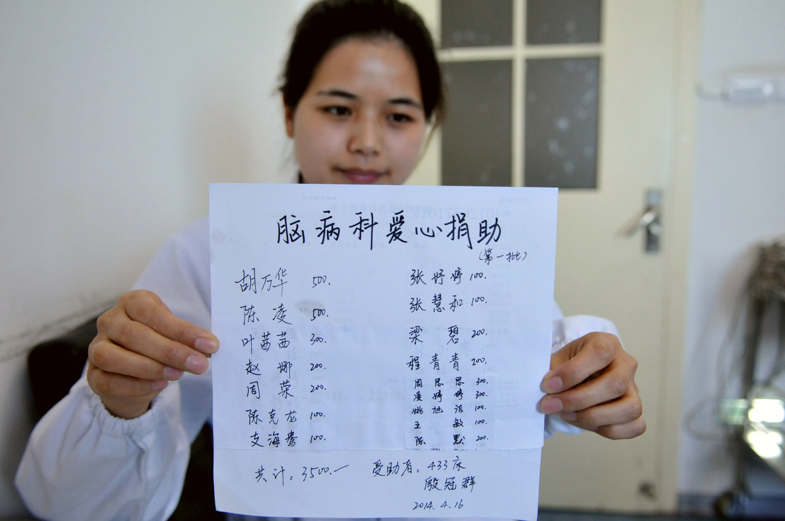 我院脑病科医护人员为贫困患者爱心募捐为贯彻落实党的群众路线教育实践活动。4月16日(周三)上午,我院脑病科党员医生及医护人员在为来自安徽的非亲非故的贫困患者殷冠群捐钱治病。他们是真正的白衣天使,但他们又都觉得自己只是做好了救人的本职工作而已…查看详情+
