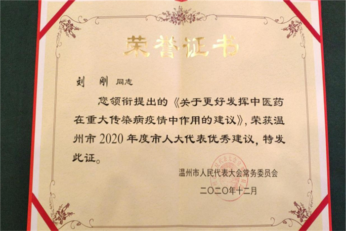 赞!我院刘刚主任的这条建议获评“温州市2020年度市人大代表优秀建议”!