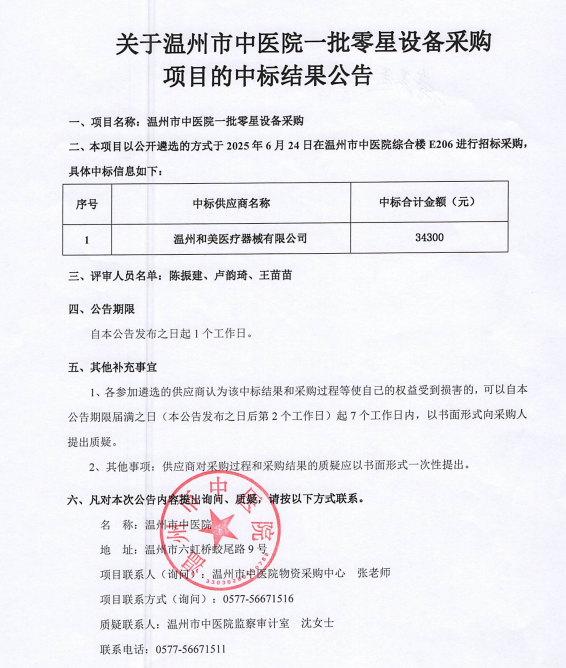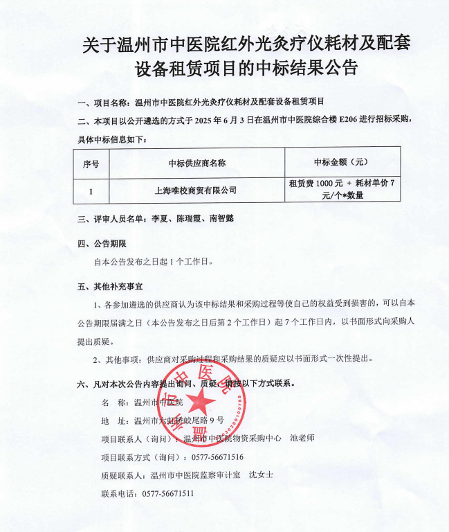 小妲己直播 红外光灸疗仪耗材及配套设备租赁项目中标公告(二)关于小妲己直播 红外光灸疗仪耗材及配套设备租赁项目,原中标供应商主动弃标,按相关法律法规和院内管理办法,由第二名顺位中标。查看详情+