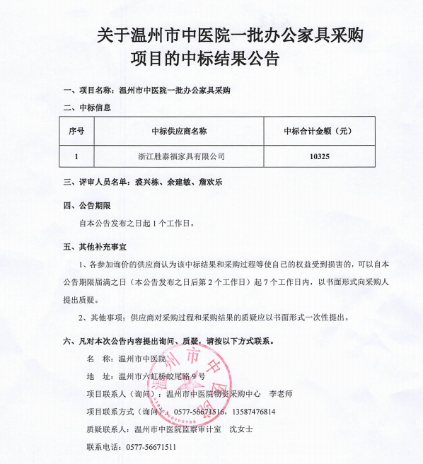 关于小妲己直播 一批办公家具采购项目的中标(成交)结果公告