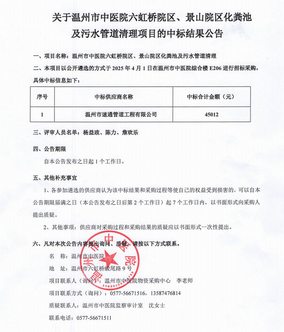 关于小妲己直播 六虹桥院区、景山院区化粪池及污水管道清理项目的中标(成交)结果公告