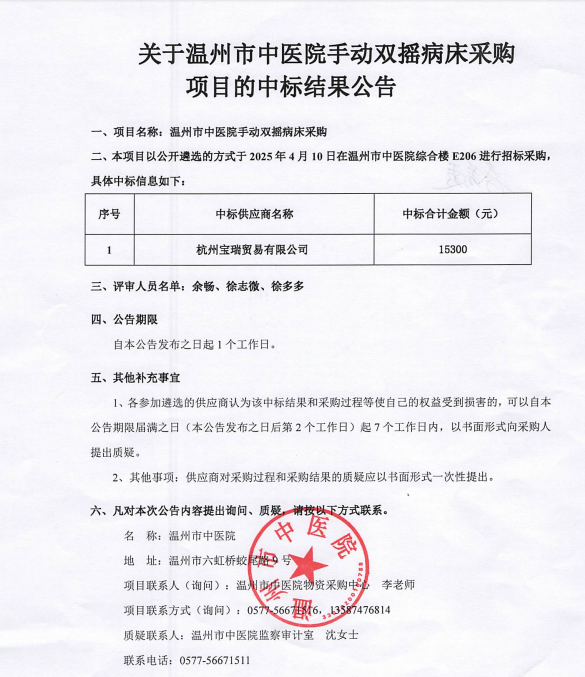 关于小妲己直播 手动双摇病床采购项目的中标(成交)结果公告