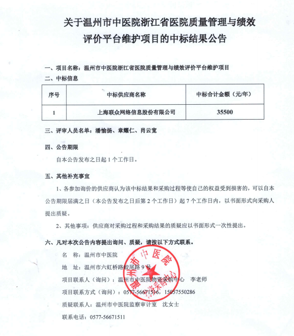关于小妲己直播 浙江省医院质量管理与绩效评价平台维护项目的中标(成交)结果公告