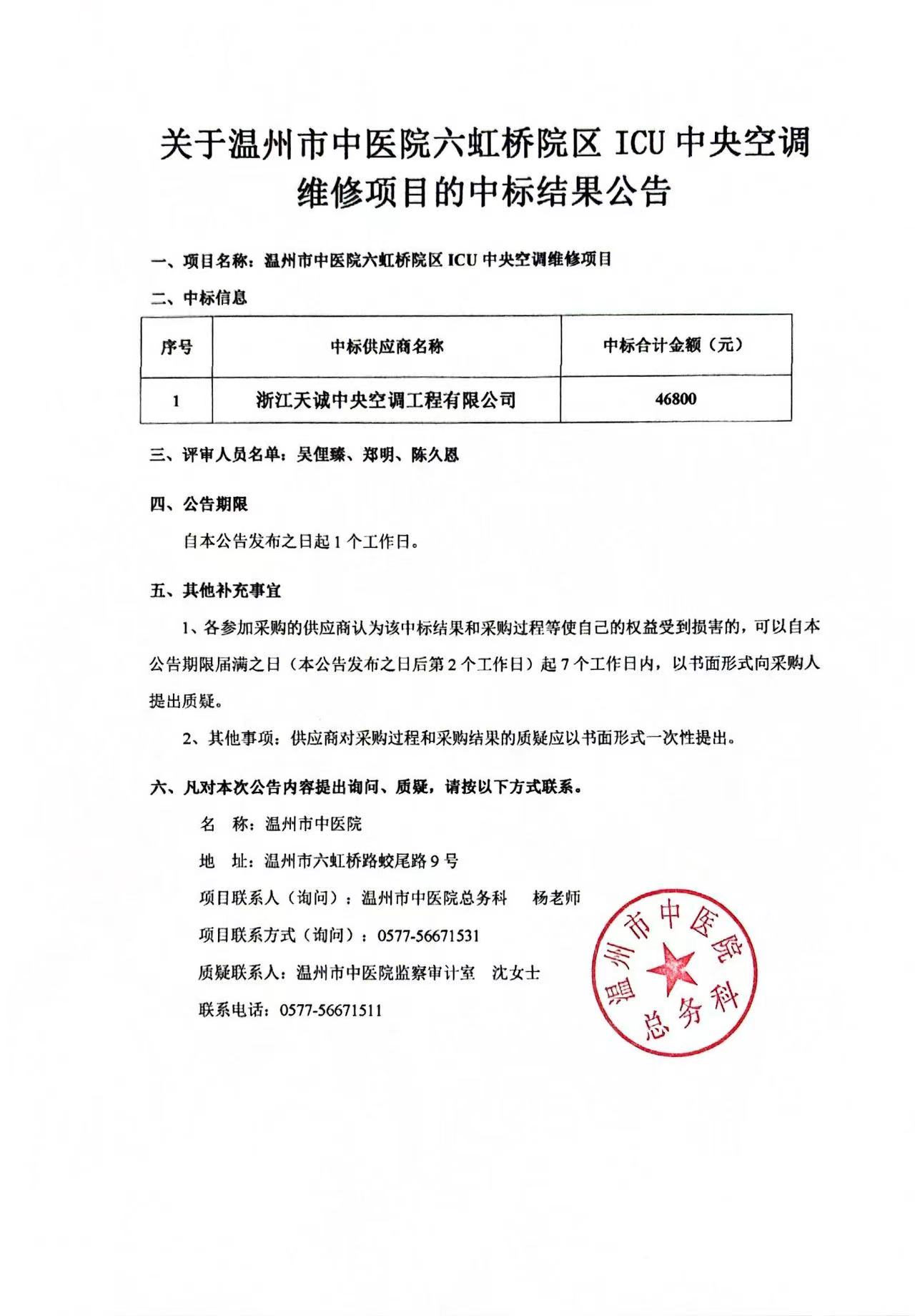 关于小妲己直播 六虹桥院区ICU中央空调维修项目的中标结果公告