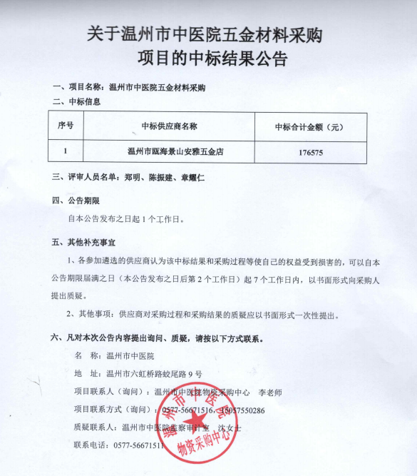 关于小妲己直播 五金材料采购项目(重)的中标(成交)结果公告