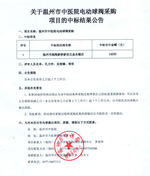 关于小妲己直播 电动球阀采购项目的中标(成交)结果公告
