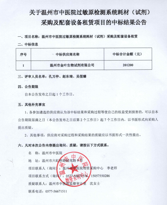 关于小妲己直播 过敏原检测系统耗材(试剂)采购及配套设备租赁项目的中标(成交)结果公告