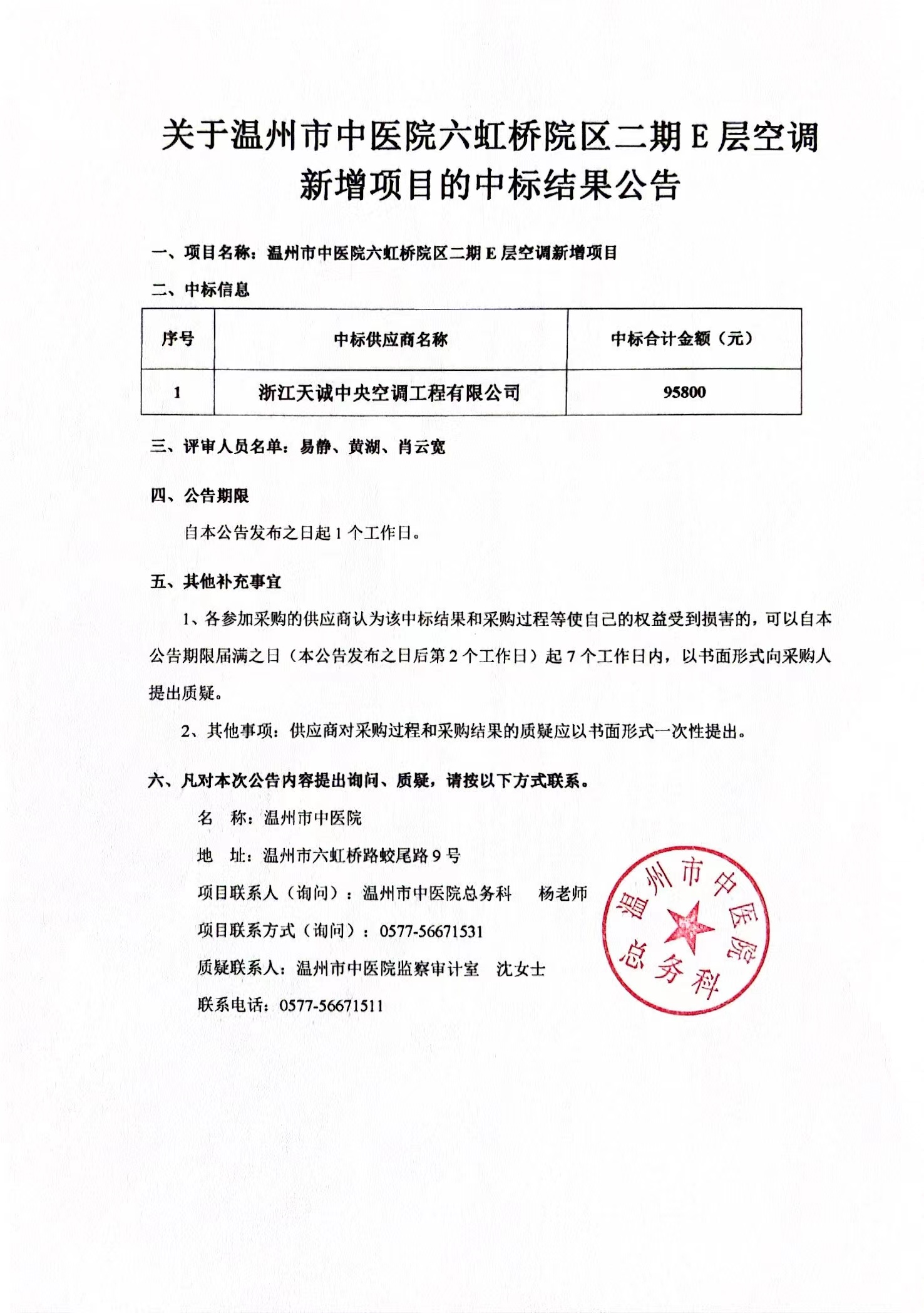 关于小妲己直播 六虹桥院区二期E层空调新增项目的中标结果公告