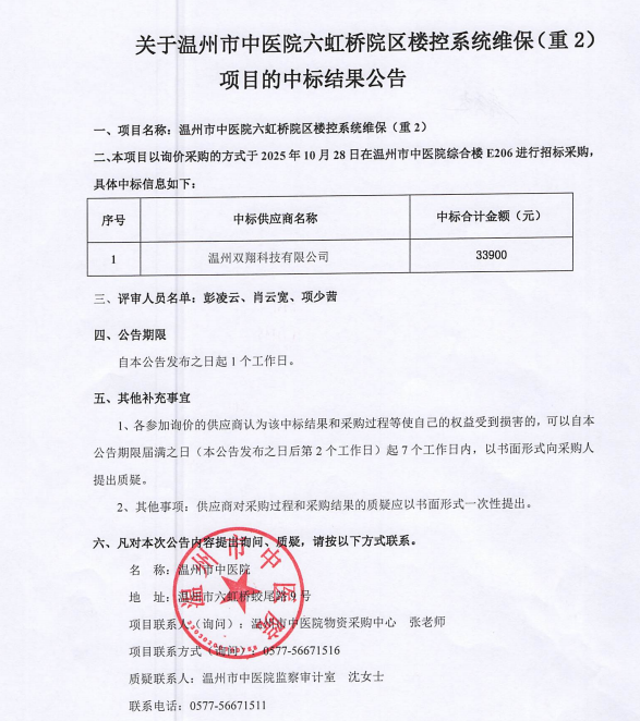 关于小妲己直播 六虹桥院区楼控系统维保(重2)项目的中标(成交)结果公告