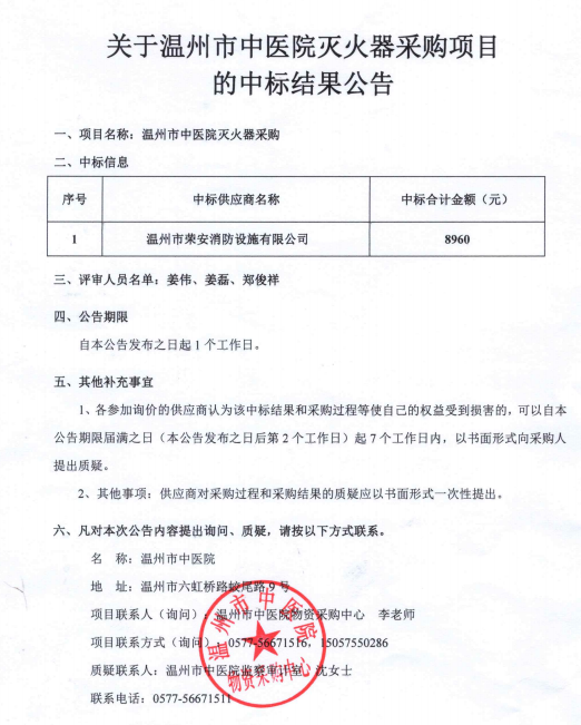 关于小妲己直播 灭火器采购项目的中标(成交)结果公告