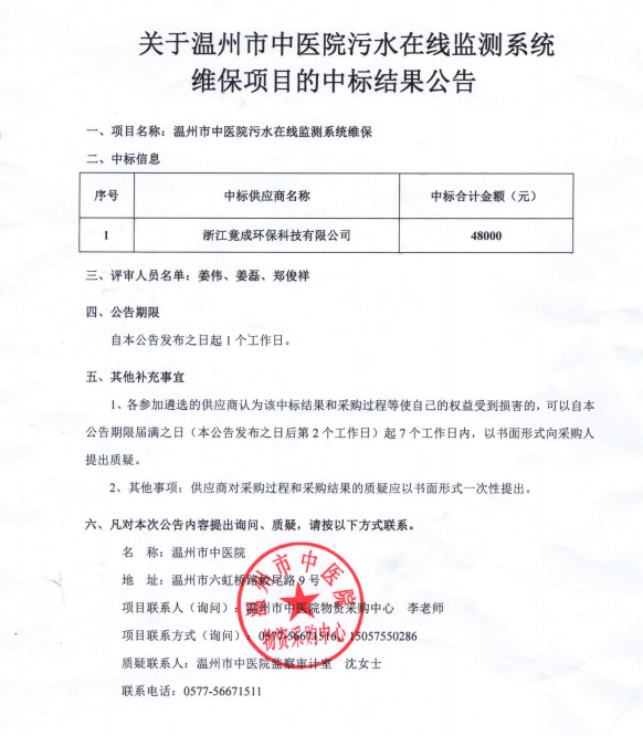关于小妲己直播 污水在线监测系统维保服务项目的中标(成交)结果公告