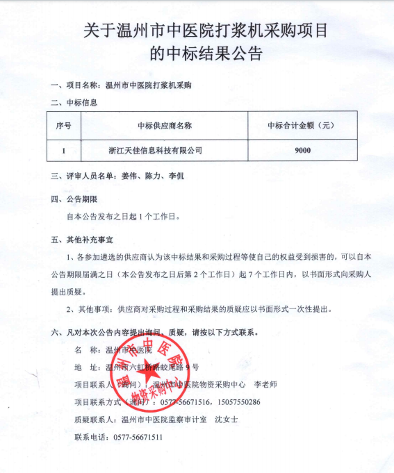 关于小妲己直播 打浆机采购项目的中标(成交)结果公告