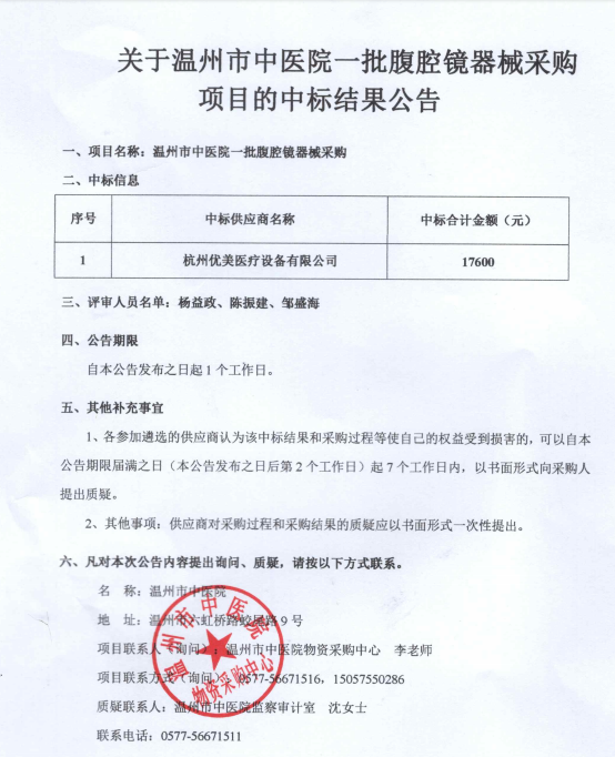 关于小妲己直播 一批腹腔镜器械采购项目的中标(成交)结果公告