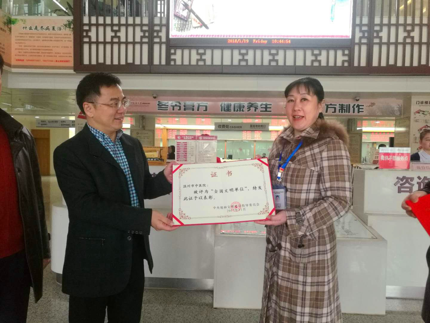 市文明办主任吕朝晖一行来院送荣誉1月19日上午,温州市委宣传部副部长、市文明办主任吕朝晖、副主任丁柏强、处长翁曙明一行专程送“全国文明单位”荣誉牌、证书到小妲己直播 六虹桥院区。党委副书记黄爱林代表医院接过“全…查看详情+