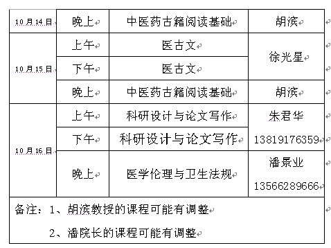 住院医师规范化培训公共必修课安排表住院医师规范化培训公共必修课定于10月14日至10月16日在温州职工中等卫生学校(卫干校)上课,请学员参加培训。 注:10月29-30日考试 上课时间早上8:00-11:00,下午2:00-5:00,晚上6:00-9:0 …查看详情+