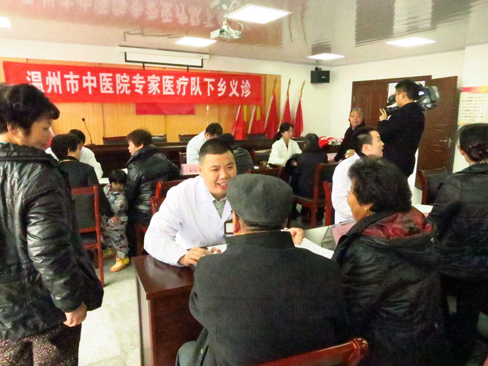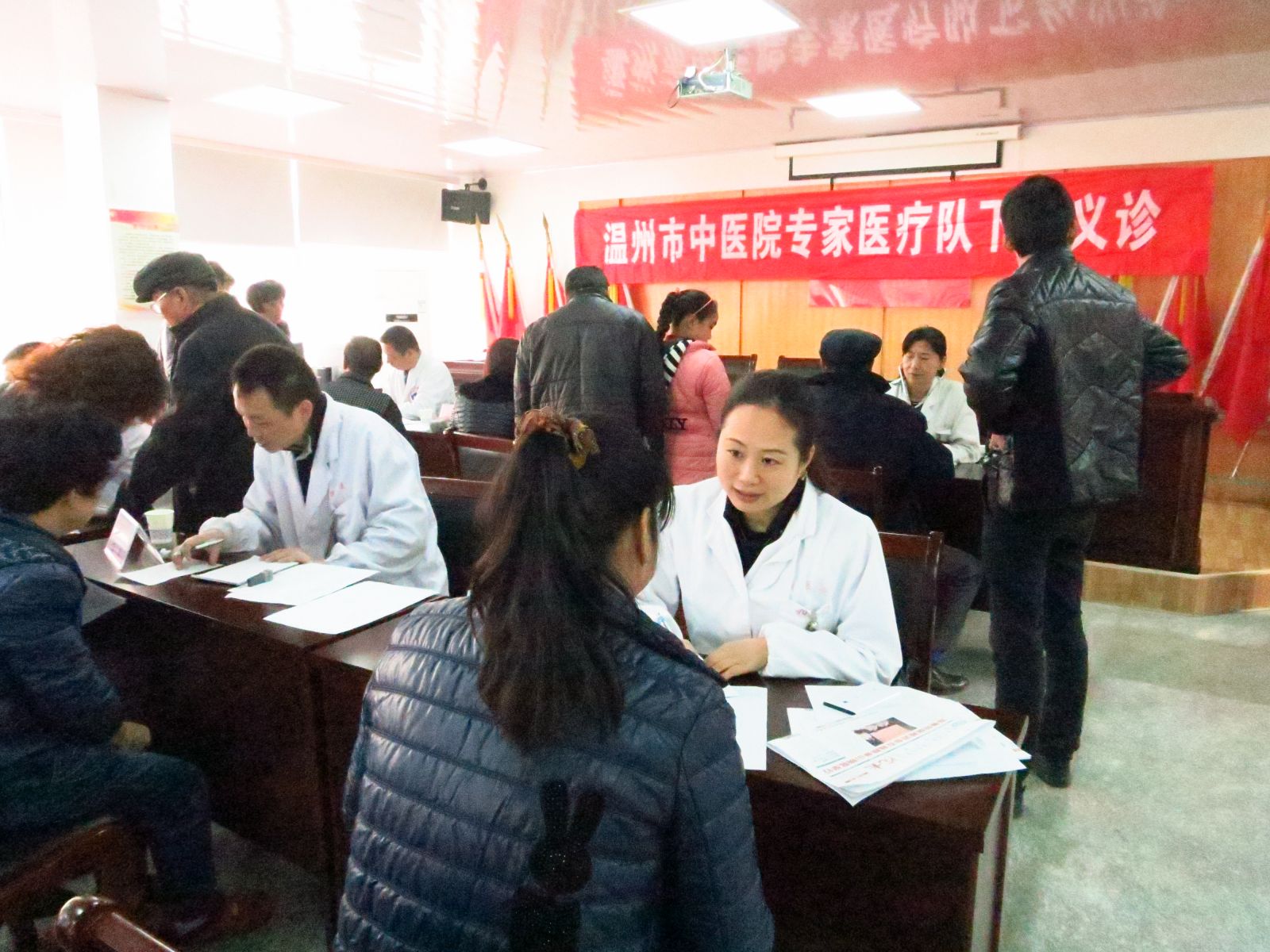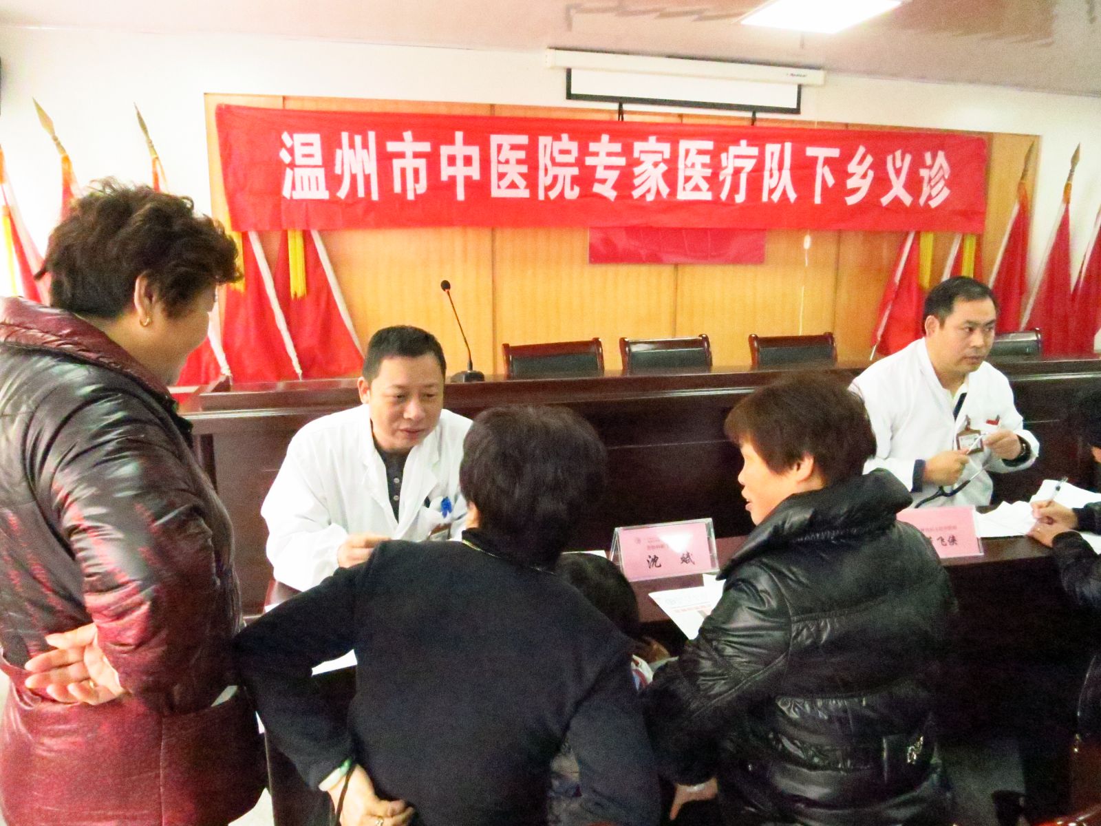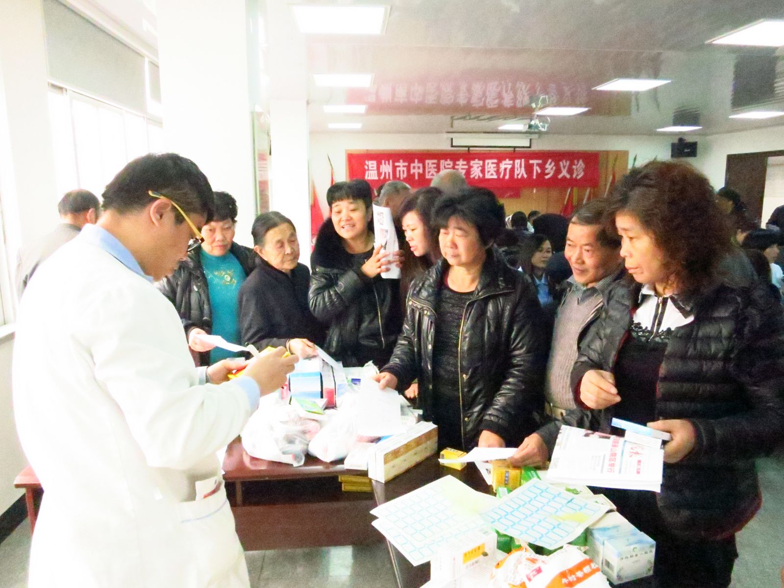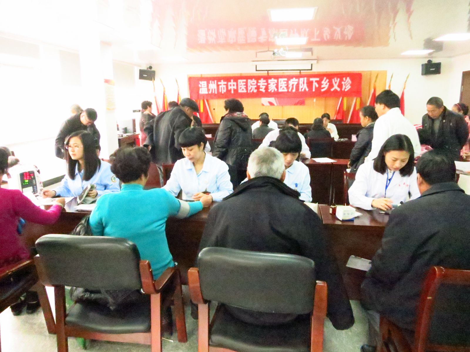 2013年12月14日上午,为响应市卫生局“三三行动”及“三好一满意”活动的号召,更好地为老区人民群众服务。我院党委在市卫生局有关领导牵头下,组织心脑科、心血管科、脑病科、肾内科、老年康复科、骨伤科、针灸科等专家医生及医护人员共15人,赴瑞安市塘下镇驮山社区开展义诊活动。塘下镇驮山社区是革命老区,浙南第一支农民武装就诞生于此,现今社区尚有几位解放前入党的老党员。活动现场,医护人员为200余名当地居民提供健康指导以及测血糖、测血压等各项检查,并免费发放价值10000余元的药品及健康宣传资料200余份。活动受到塘下镇驮山社区干部及当地群众的欢迎。瑞安电视台予以报道。