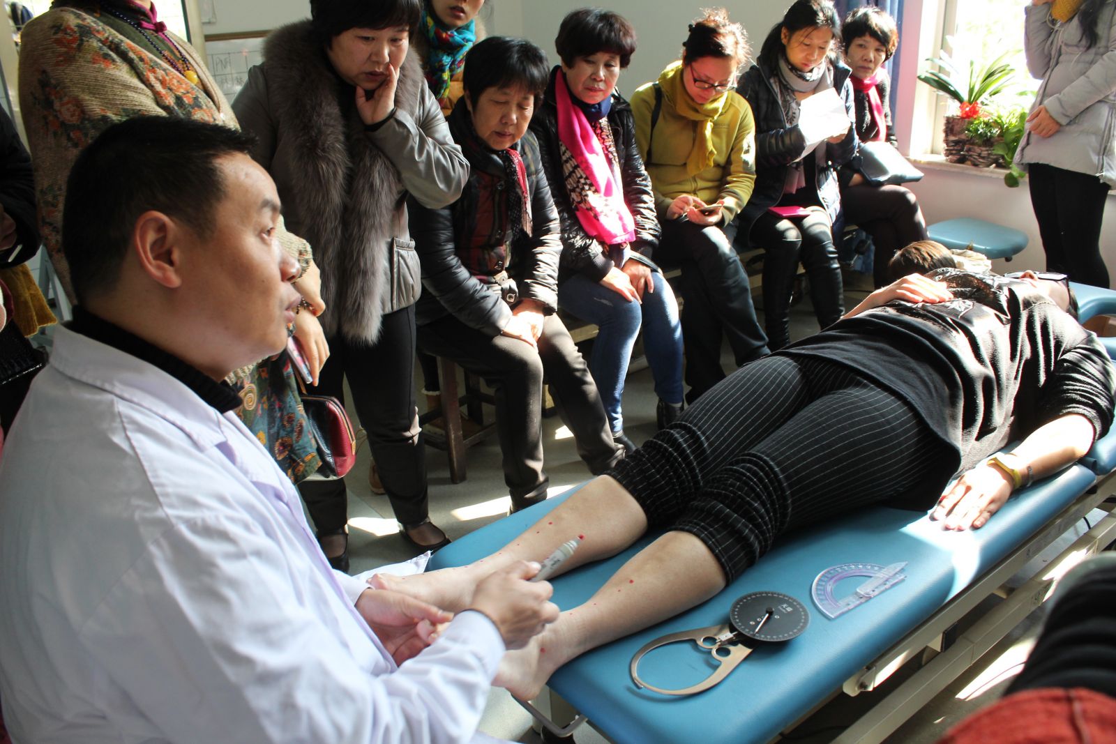 (学经络拍打操来保健——由门诊分诊护士带领大家做经络拍打操。拍打经络和穴位可以延年益寿。经络拍打操讲究“准”,所以大家都学得很认真)