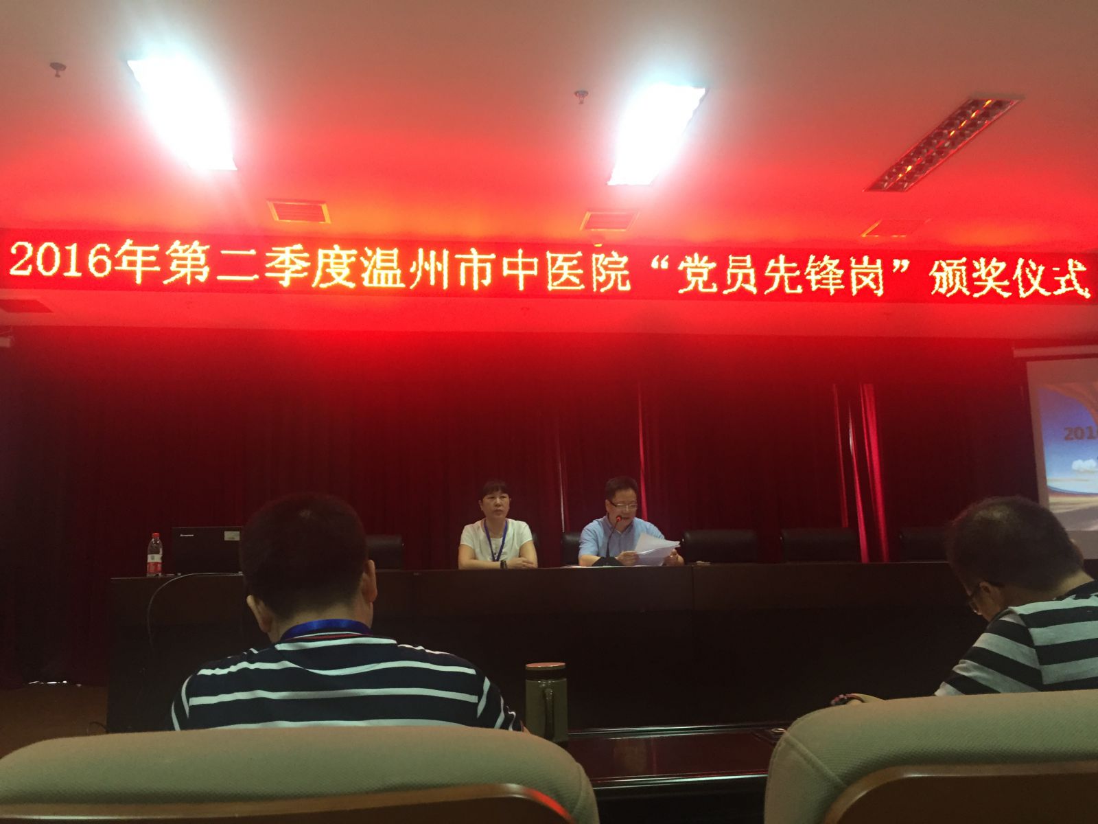 为了深入推进“两学一做”学习教育活动,7月21日下午,我院在市急救中心三楼会议室举行“两学一做”专题党课暨2016年第二季度“党员先锋岗”颁奖仪式。医院领导班子、全体党员及中层干部参加了会议,会议由院党委副书记黄爱林同志主持。