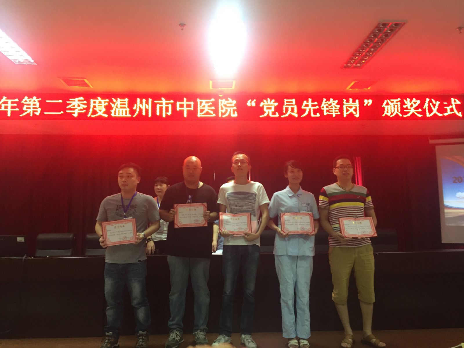 会上,我院黄建平院长还发表了重要讲话,并对2016年第二季度“党员先锋岗”进行了表彰。我院门诊支部王环芬、行政后勤支部金乐人、综合支部徐雄新、大士门支部谷小甫、水心景山支部张爱国、内科支部金微微被评为2016年第二季度“党员先锋岗”。