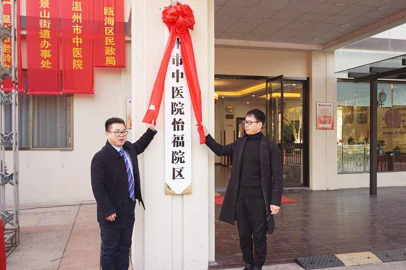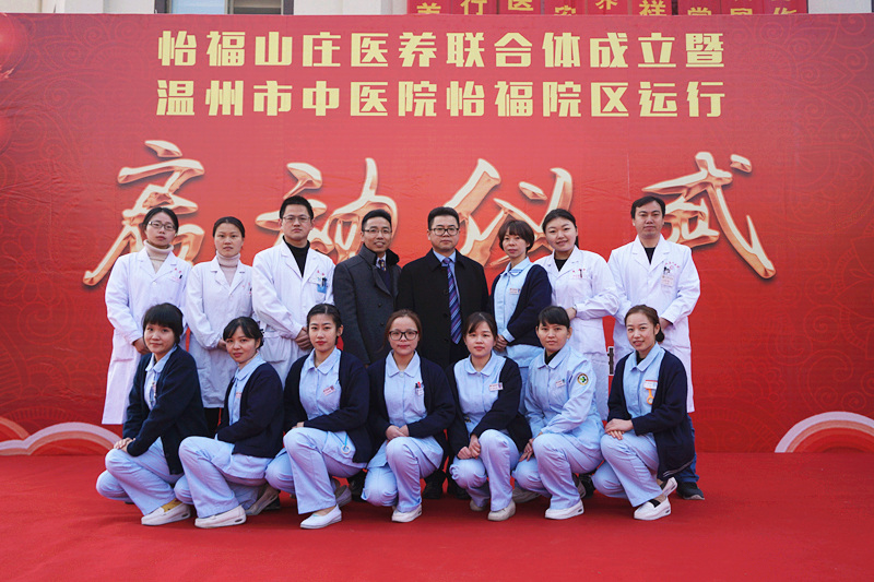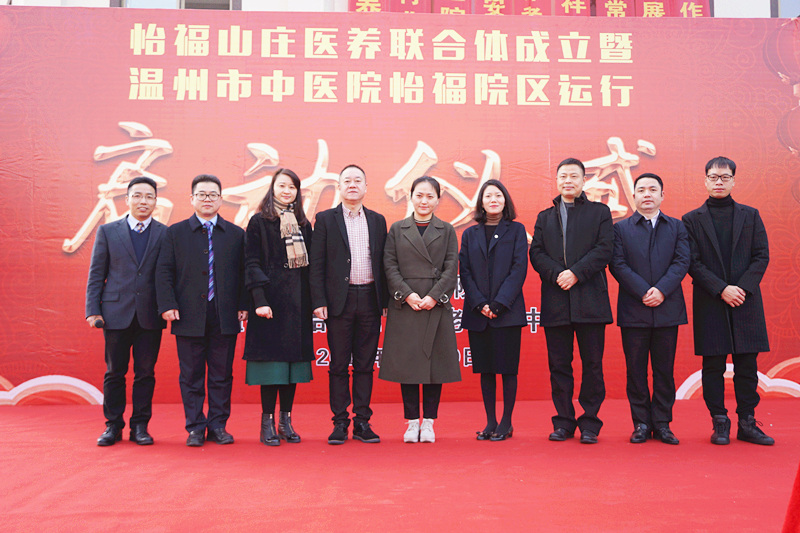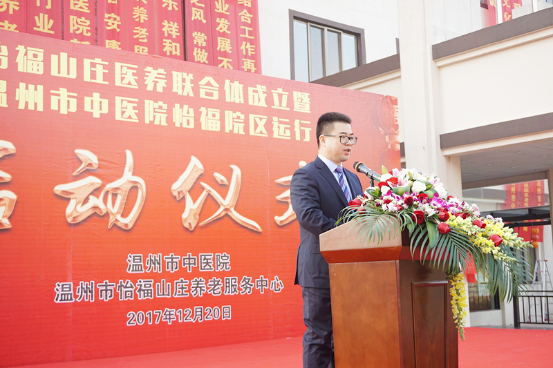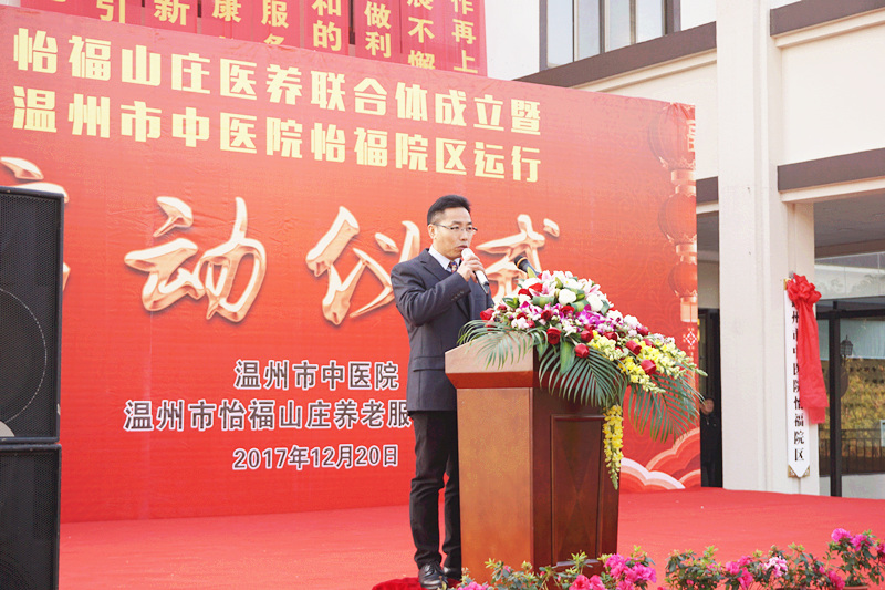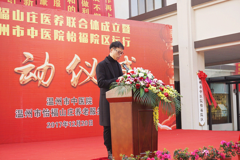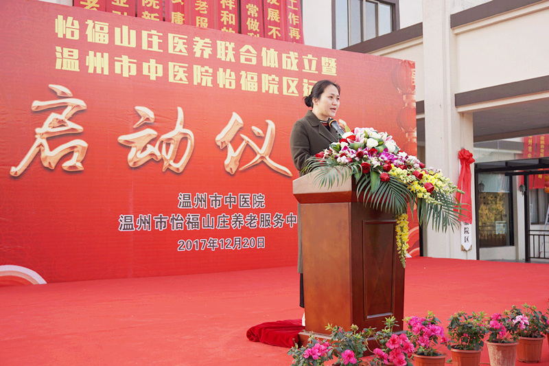 12月20日上午,怡福山庄医养联合体成立暨我院怡福院区开办仪式在景山怡福山庄隆重举行。温州市卫计委副主任吴尚斌、瓯海区副区长吕舸南、我院院长王庆来、温州市卫计委计划生育家庭发展处处长陈靖、温州市卫计委宣传处杨鹏、温州市社会养老服务指导中心主任陈娅莉、瓯海区民政局局长姜文龙、景山街道办事处书记叶展、温州市怡福山庄养老服务中心总经理陈建勇等领导和嘉宾出席了仪式。