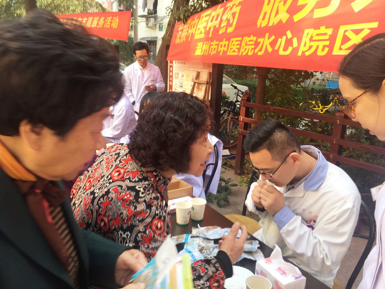 活动现场我院护士为居民们量血压、测血糖、耳穴埋豆,内分泌科和妇科医生现场诊治,针推医生进行针灸、推拿等中医特色治疗,中药师提供中药咨询服务,宣传冬令膏方知识,水心院办和门诊部分发宣传手册,进行健康宣教,同时将我院专家团队和特色中医药服务介绍给居民们。现场气氛十分热烈。