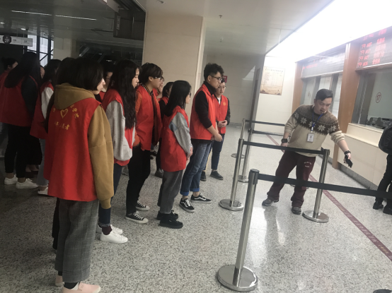 在简单讲解我院团委普安志工的历史后,徐书记将志愿者们直接带到了门诊大厅,从一楼开始,一层一层,拾阶而上,现场为志愿者讲解志愿服务的要点。志愿者们认真听取了徐书记的讲话,发现问题立刻提问,现场气氛热烈、融洽。