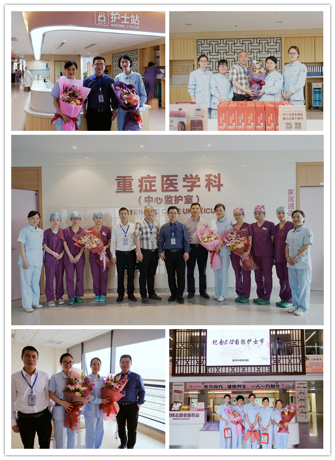 火红的五月,阳光明媚,繁花似锦。在这春与夏交汇的季节,我院全体护士迎来了第106个国际护士节。5月12日上午,领导班子王庆来院长、黄爱林副书记、麻瑞龙副院长、朱文宗副院长、缪心军副院长前往六虹桥院区、景山院区、水心院区及大士门院区,为全体护士们送上"一杯(辈)子"的祝福,表达了领导班子对全体护士最真诚的祝福与关怀,让我们的守护天使们在5.12这样特殊的日子里感受到温暖与爱。 (慰问六虹桥院区护士)