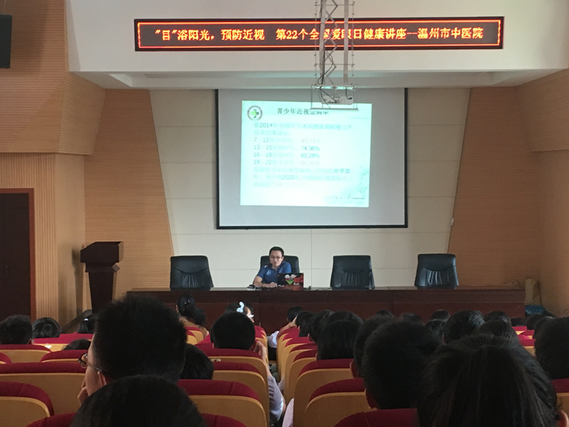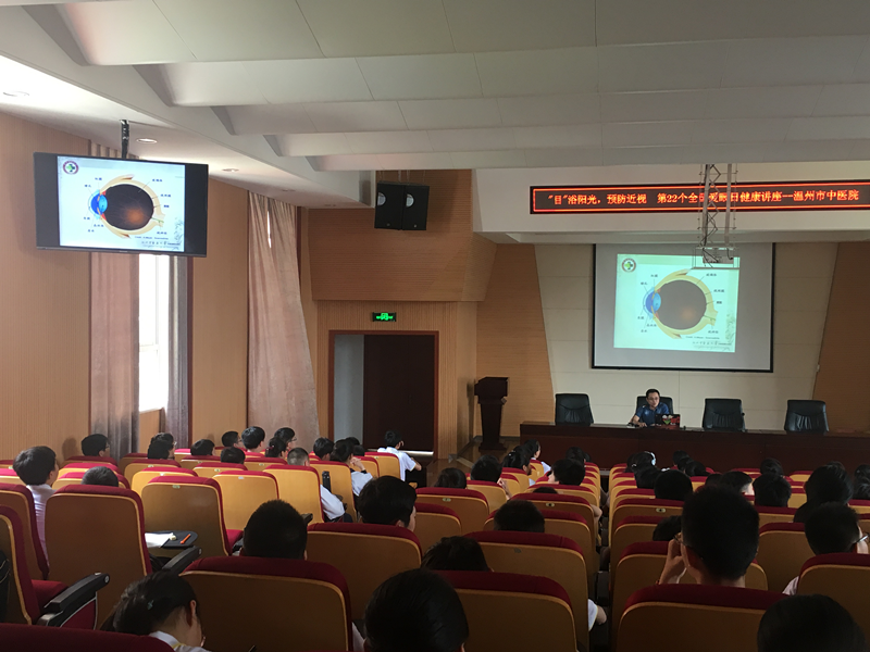 “目”浴阳光,预防近视,是2017年全国第22个爱眼日的主题。为不断增强学生的爱眼、护眼意识,提高学生在眼保健方面的科普程度,促进学生养成良好的用眼卫生习惯,我院于6月6日在瓯海实验中学开展了爱眼日健康教育讲座。眼科医师张爱为现场的学生带来了一场别开生面的护眼知识讲座,通过学习眼保健操、眼科知识问答等方式为学生普及科学用眼、护眼的知识和方法。现场氛围热烈,学生纷纷表示受益匪浅。