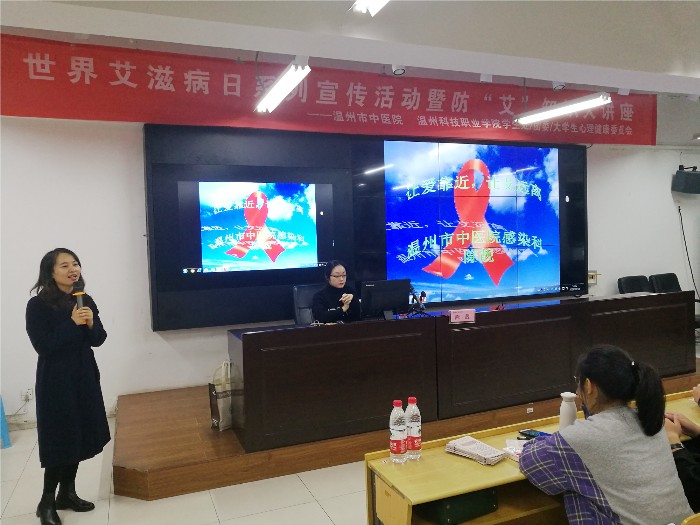 为向学生群体普及艾滋病相关知识,我院联合温科院开展了艾滋病日宣传活动,11月28日下午在温科院设立艾滋病咨询点,我院感染科郑金莲主任及刘三海医师为学生们答疑解惑。晚上,感染科陈靓医师开展讲座《让爱靠近,让艾远离》,向在场学生讲解艾滋病相关知识及防治要点。
