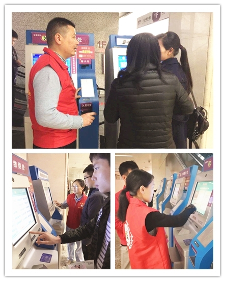 每天早上,在我院六虹桥院区的一楼门诊大厅,门诊支部的志愿者们利用非工作时间,用热情和微笑帮助患者办理就诊卡、为患者指引方向、解答疑惑、维持秩序,在自助一体机前也有他们帮助患者挂号、打印化验单、缴费的身影,志愿者们的“红马甲”为医院增添了一抹亮丽的色彩。