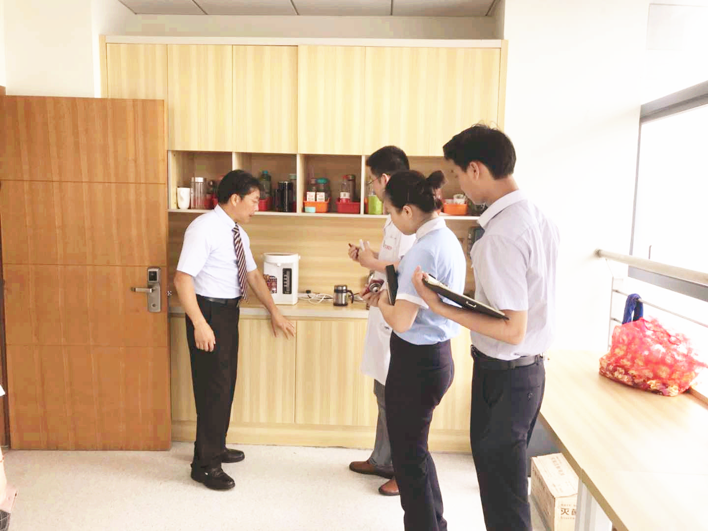 2018年5月7日,精细化培训导师团队前往我院各医生办公室进行现场查看与指导。现场督导结束后,在综合楼五楼大会议室举行了当日现场调查的反馈会,现场潘良吉导师对5s管理的理念进行了讲解,培训团队与在现场各位医生进行了讨论,多位科室主任在现场也提出了自己的建议。