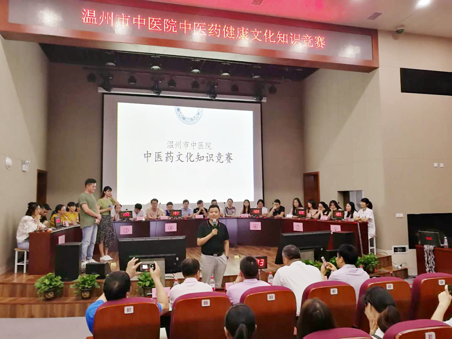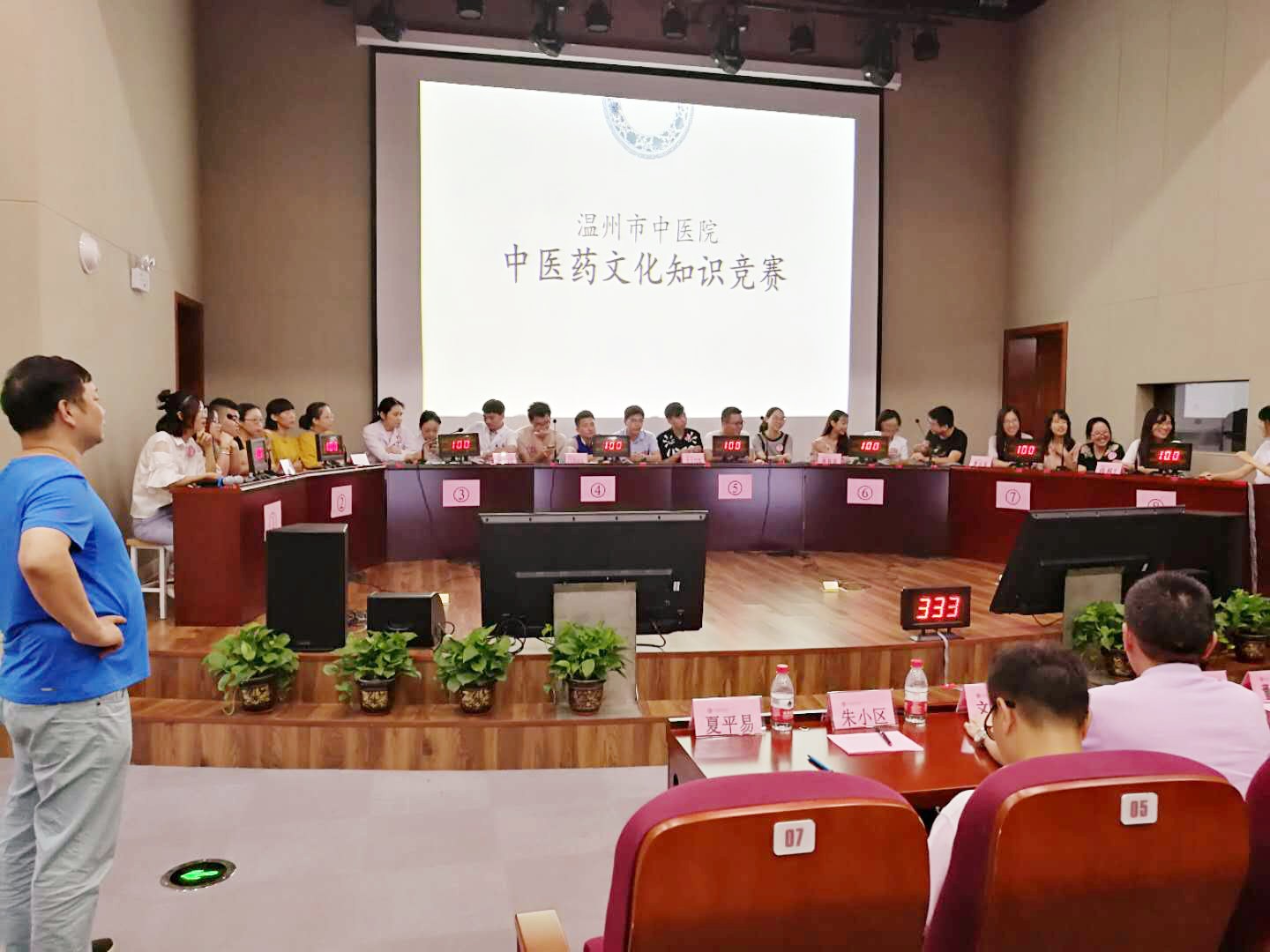 活动开始前,工作人员安排参赛队员进行桌号抽签。随后,中药房代表队(计楚君、李烜诚、朱晶晶),水心代表队(陈蕾蕾、胡欣欣、陈祥艳),内科2代表队(戴朝明、陈靓、刘云宵),门急诊代表队(王密、黄定靠、缪江),大士门代表队(项方家、刘曦、木林洁),外科代表队( 陈铂、李倩倩、赵玲玲),景山代表队(叶飞、陈佳君、杜倩),内科1代表队(管子函、叶影、陈妙)按照抽签结果对号入座,并佩戴队内队号袖标。