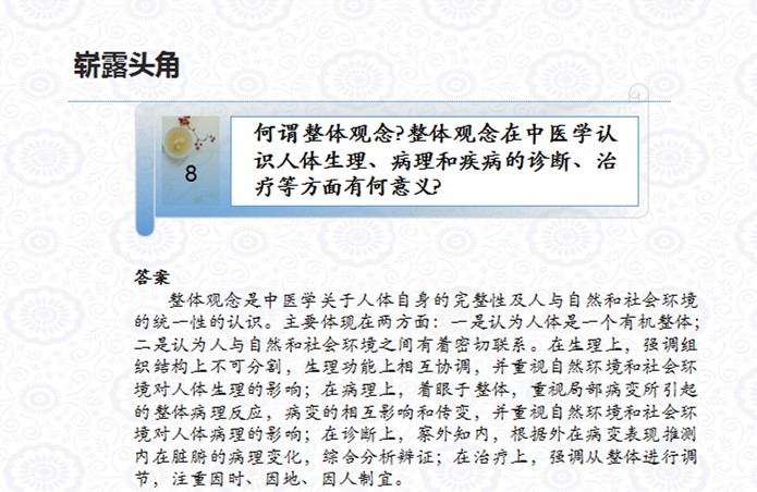 “崭露头角”环节共有8个题目,题型为论述题。主持人按照1号桌,2号桌,3号桌,4号桌,5号桌,6号桌,7号桌,8号桌顺序,读题,由指定桌号人员合力作答。答题思考时间1分钟,答题时间3分钟。(由代表队内部推选一人作答即可)。作答情况由评委评判打分。