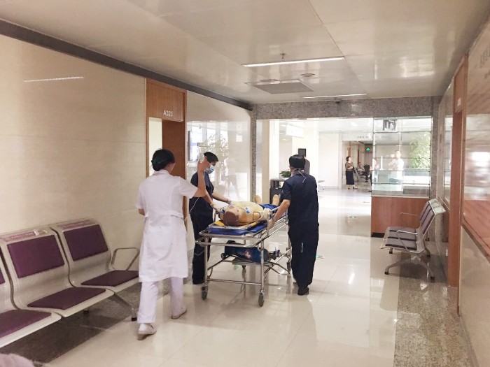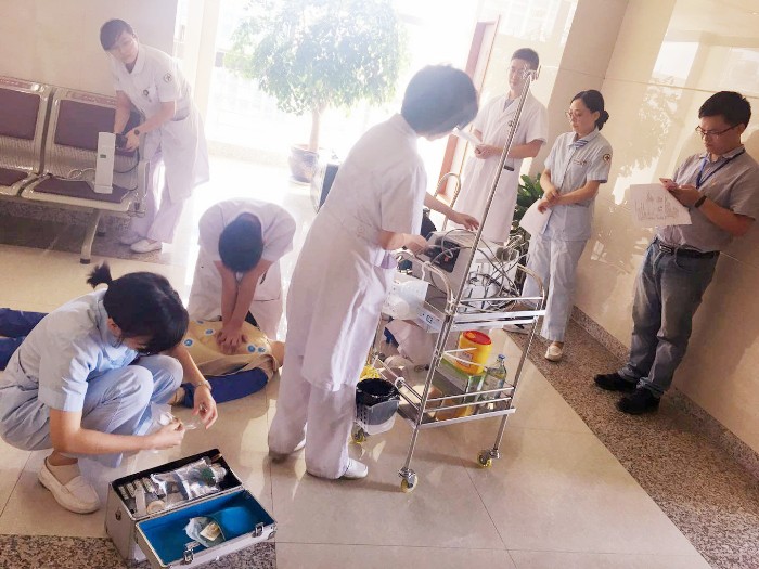 为进一步提高我院门诊医护人员在面临突发事件时的应急反应和处置能力,有效保障人民群众的身体健康和生命安全,门诊部依据突发事件应急预案要求,经过周密策划、详细安排,联合急诊科、护理部、医务科、保卫科、后勤、院感、保健科等多个科室于2018年9月26日下午,开展了“门诊科室检查患者呼吸心跳骤停、心肺复苏”、“门诊职业暴露”(门诊处理及隔离防护手卫生)、“急诊会诊”三项应急演练。