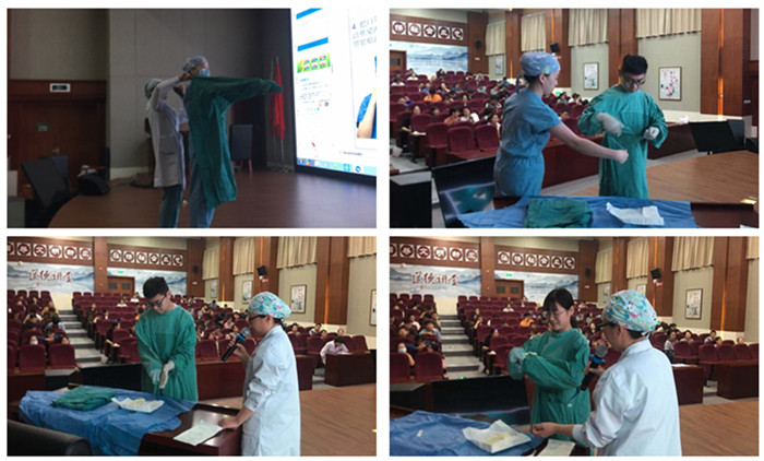 这次培训主要内容为手术室准入相关重要技术,如戴外科口罩和帽子、外科洗手法、穿脱无菌手术衣、封闭式戴无菌手套等。首先由手术室缪霜霜护士授课《增强防控意识 杜绝手术部位感染》,再由手术室孙潜护士做现场演示,大家认真听讲,做笔记,拍照片。互动环节中两位医生自告奋勇,上台体验学习,得到大家的掌声鼓励。