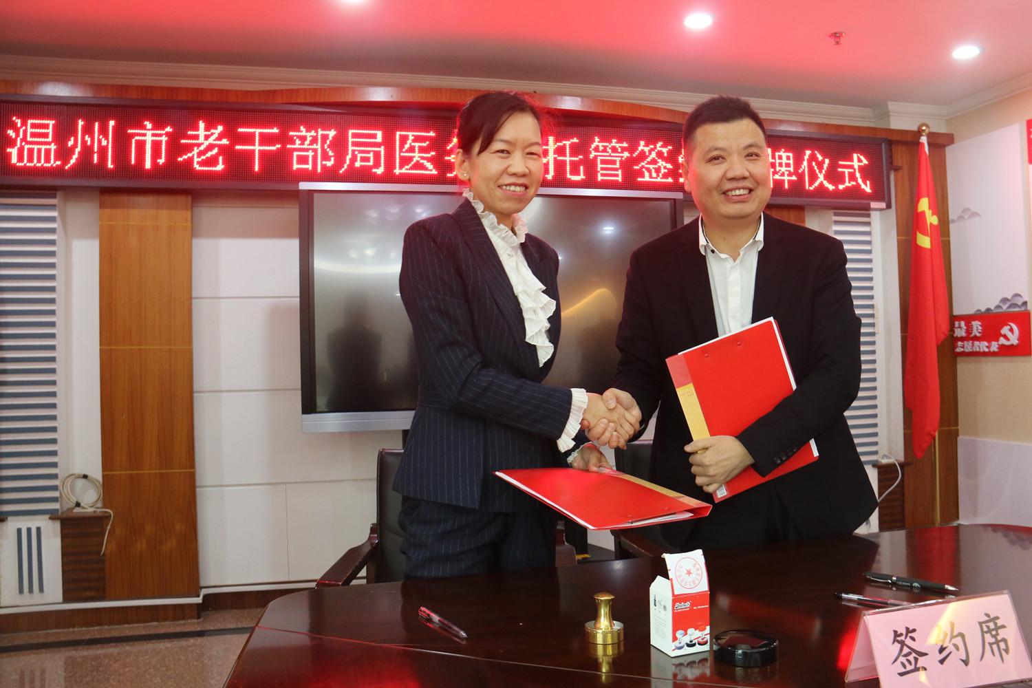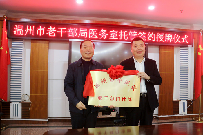 为促进优质医疗资源共享,提高基层医疗卫生服务水平,满足老干部对医疗技术服务的需求,11月26日上午,我院与温州市老干部局在温州市老干部活动中心举行了医务室托管签约授牌仪式。