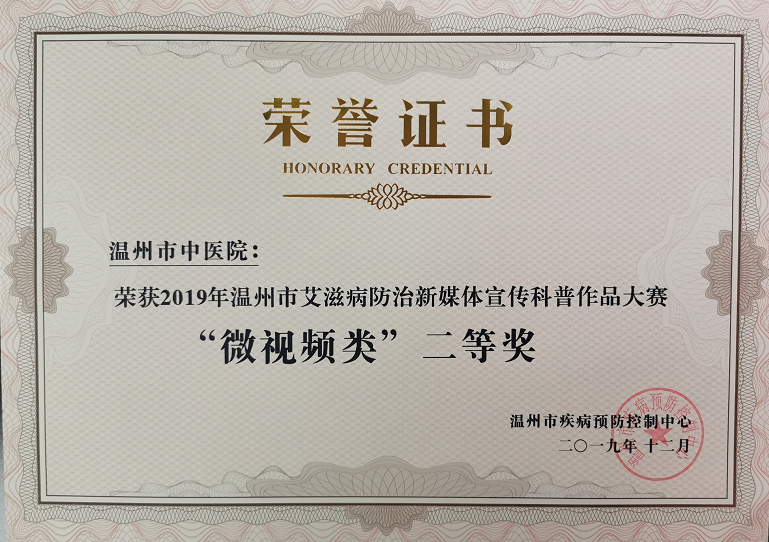 为迎接第32个“世界艾滋病日”,更好地向公众普及艾滋病防治知识,提高公众防艾意识和技能,推动艾滋病防治新媒体科普宣传的应用,温州市疾病预防控制中心开展了2019年温州市艾滋病防治新媒体科普视频作品大赛活动。经过激烈的角逐,我院感染(肝病)科团队制作的艾滋病科普微视频《遇见爱·拒绝艾》从80件参赛作品中脱颖而出,喜获“微视频类”二等奖。