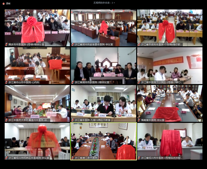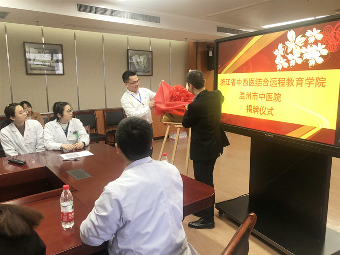 仪式中,副院长缪心军、医务科科长陈念昭共同为浙江省中西医结合远程教育学院(小妲己直播 站点)揭牌。