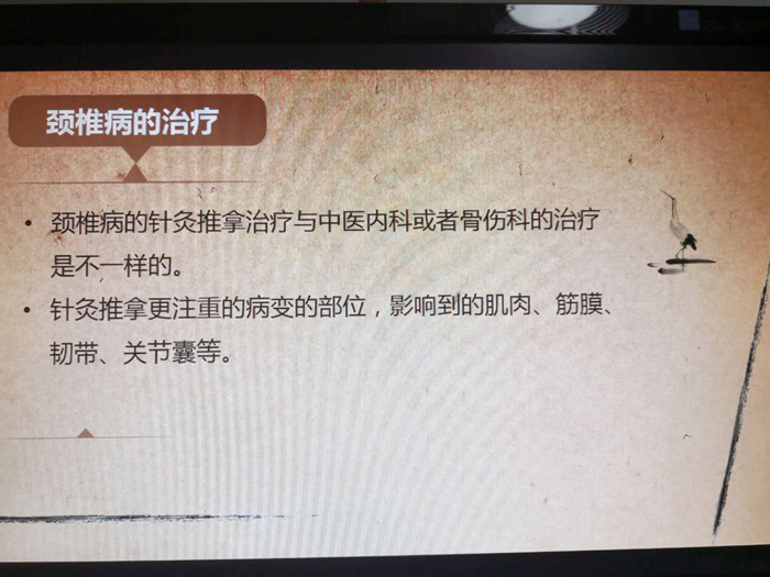 随后我科宋丰军主任,作了“颈椎病的针灸推拿临床诊疗思路”讲座,从颈椎病的概念差异、发病因素、针灸推拿治疗与中医内科及骨伤临床诊疗的不同,颈椎病的预防,最后介绍了一个安全有效的颈椎正骨手法,并现场演示操作,为大家细细阐述了推拿手法的技巧及经验,让大家收获满满。