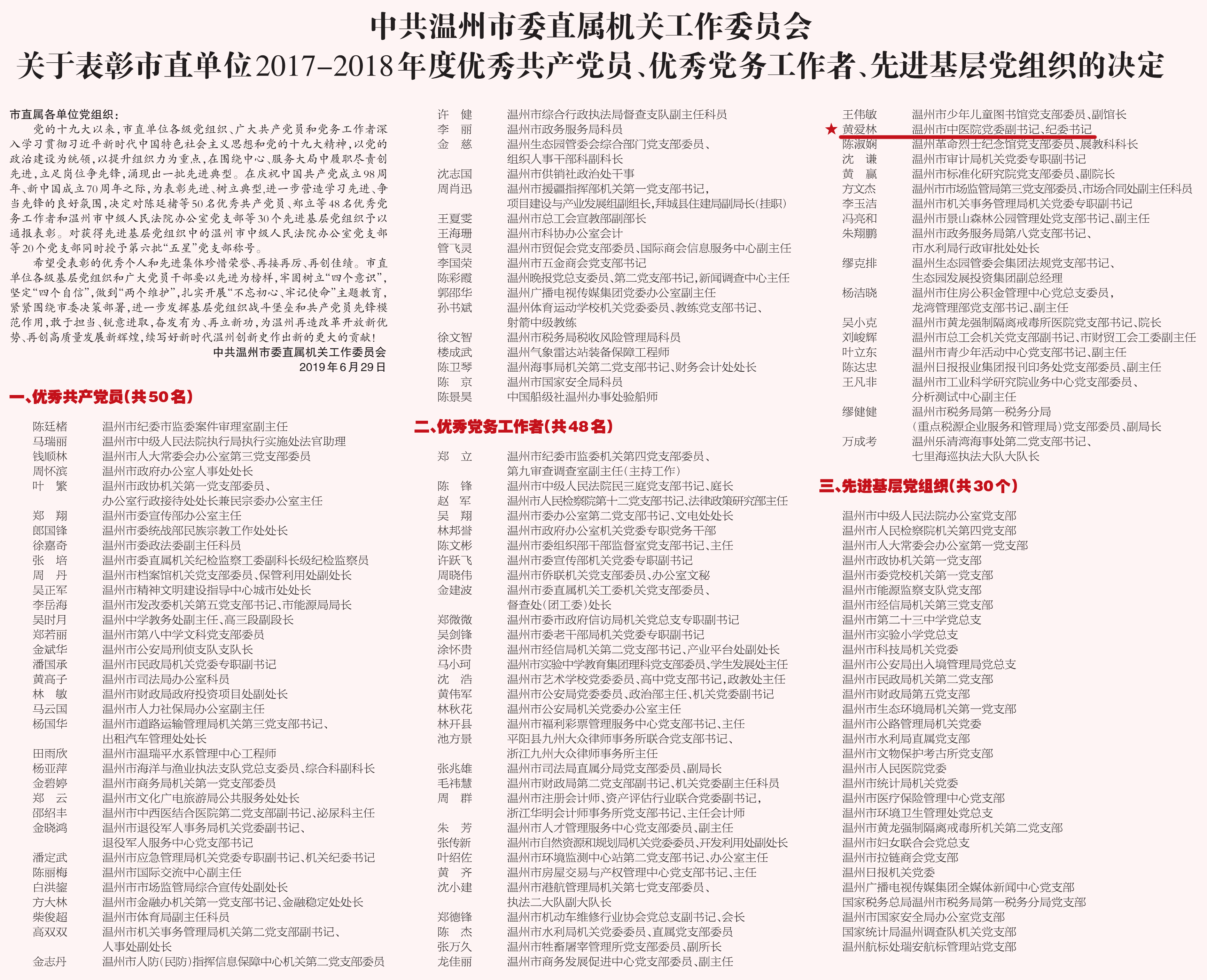 党的十九大以来,市直单位各级党组织、广大共产党员和党务工作者深入学习贯彻习近平新时代中国特色社会主义思想和党的十九大精神,以党的政治建设为统领,以提升组织力为重点,在围绕中心、服务大局中履职尽责创先进,立足岗位争先锋,涌现出一批先进典型。在庆祝中国共产党成立98周年、新中国成立70周年之际,为表彰先进、树立典型,进一步营造学习先进、争当先锋的良好氛围,决定对优秀共产党员、优秀党务工作者和先进基层党组织予以通报表彰。