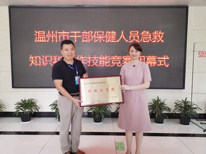 (温州市卫健委干部保健处陈靖处长为我院带队领导朱文宗院长颁发团体二等奖奖牌)