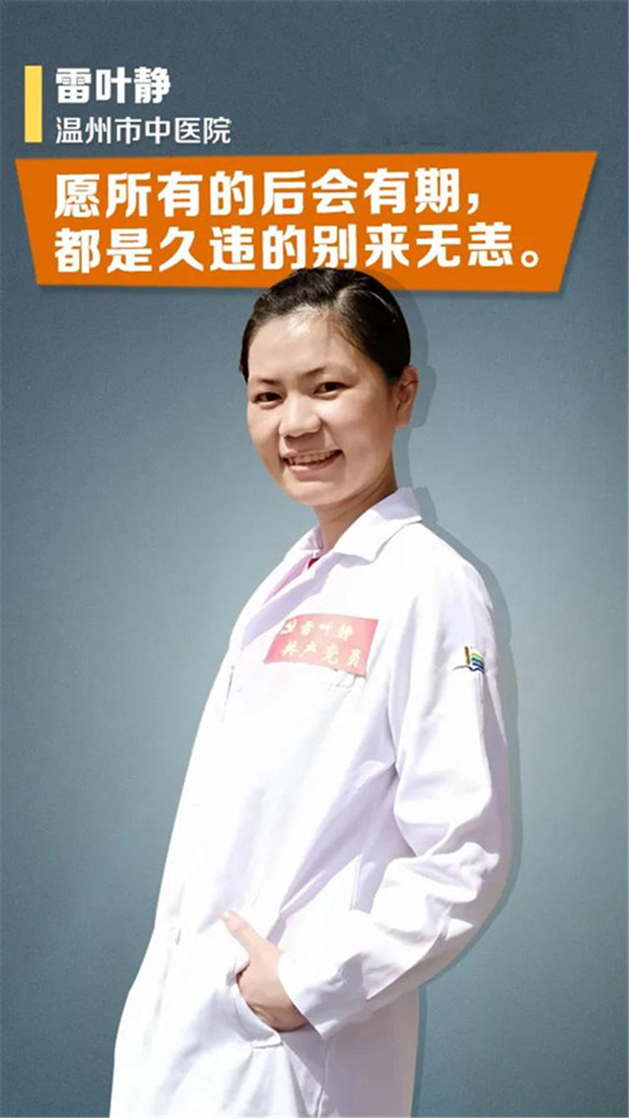 全国三八红旗手,是由中华人民共和国妇女工作组织颁发给优秀劳动妇女的荣誉称号,主要是表彰在中国各条战线上为社会主义物质文明和精神文明建设做出显著成绩的妇女先进个人和妇女先进集体。浙江本次仅有34名个人被评为全国三八红旗手,温州卫健系统仅1个名额,这是国家级的荣耀,这同时也是责任。武汉回归后,雷叶静护士长继续投入病房工作,管理她的护理队伍,为她的病人负责。