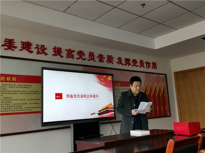 最后,胡万华同志对自己的转正申请书进行宣读,介绍了自己的思想、学习、工作生活情况,及在学习科研、实践中扮演的角色。赵娜作为介绍人,对其基本情况介绍后,认为符合党员条件,同意转正。之后,与会的正式代表经过投票,胡万华同志正式成为内科支部的一员。赵娜书记为其带上党徽,并表示祝贺。
