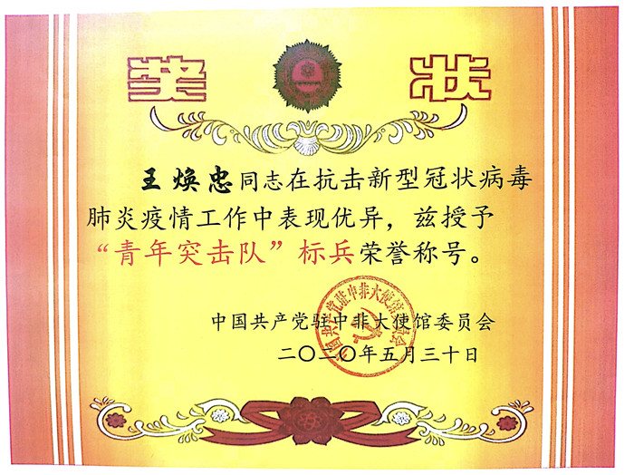 凭借疫情防控期间的良好表现,王焕忠被中国共产党驻中非大使馆委员会评为“抗疫标兵”,而面对这份肯定,他常说的一句就是:“我不能像你们一样在前线抗疫工作,但是我希望保证好大家的饮食安全,不拖大家后腿”。平平淡淡的一句话,更是道出了战友情,这就是对医疗队抗疫最大的支持!