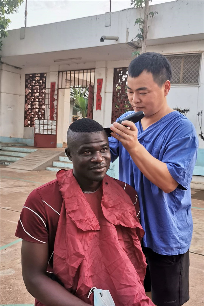 工作之余,王焕忠看到大家飞长的头发,他就利用休息时间通过看视频、查资料、微信视频联系国内理发师傅,不断学习理发技术,开始为队员理发。板寸、背头、分头……什么最新潮的发型在这里都可以得到满足,他还会根据女队员们的要求,修剪出每个人喜欢的发型;一旁驻足观看许久的中非籍雇员也忍不住叫王焕忠给他修理一番。毫无疑问, “完美”的理发水平自然又让他得到又一个美称“tony王”。