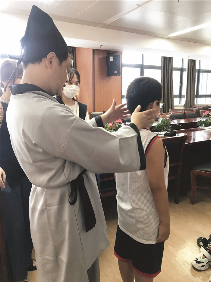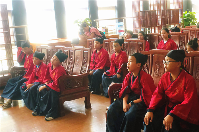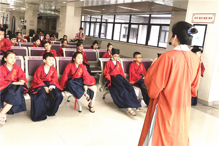 门诊六楼名医馆,穿戴好医院特意准备的汉服,女孩子戴上发簪,男孩子则冠以秀才帽,各个神气十足,仿佛穿越到了中医盛行的年代。