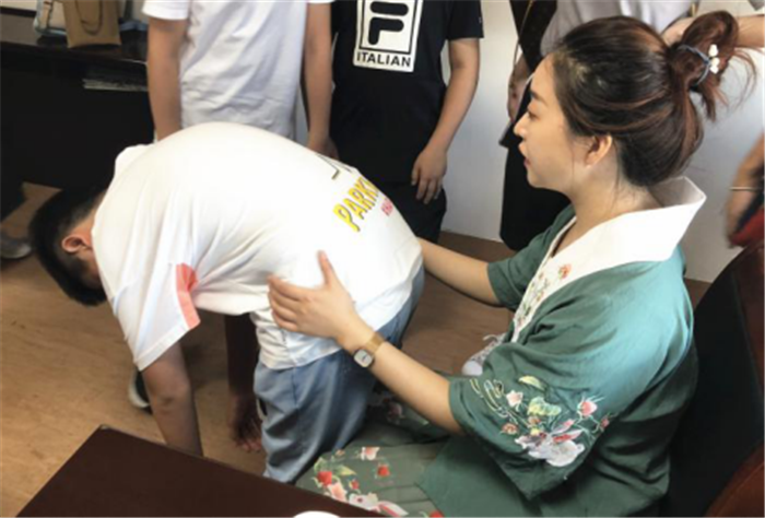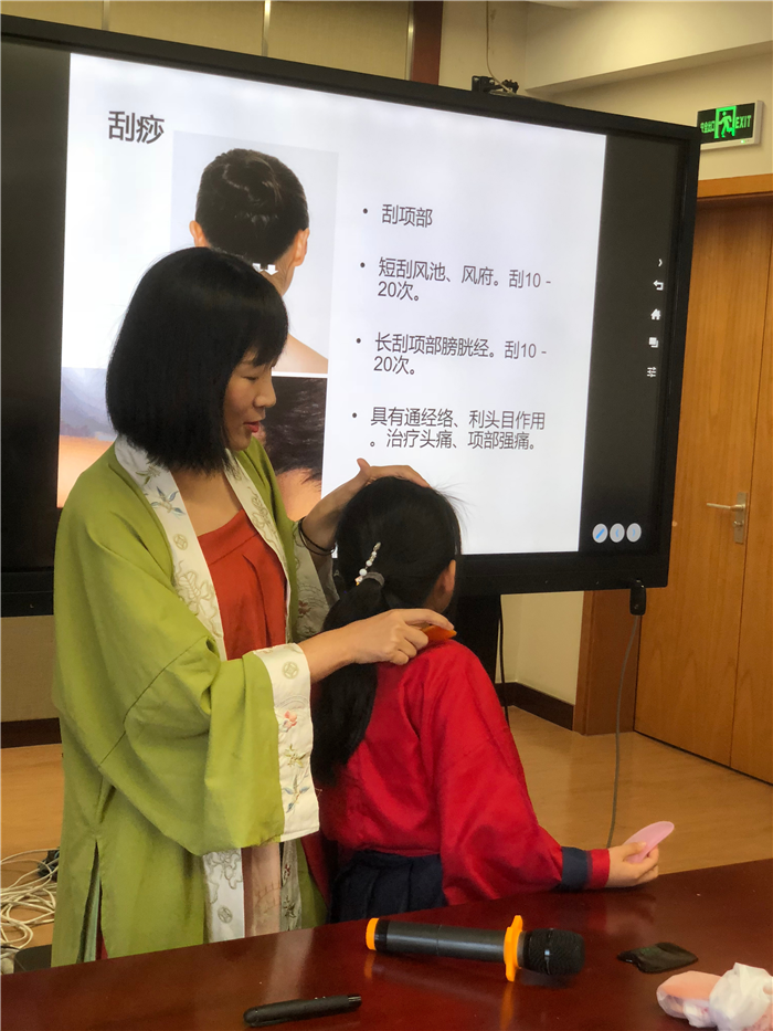 针灸推拿科副主任中医师潘胜莲的刮痧课,让孩子们摇身一变成为了小小“中医师”。经过认真的听课后,大家拿起刮痧板有模有样地在家长身上做起练习,在医生的指导下,很多人都掌握了原理,成功刮出了“痧”。