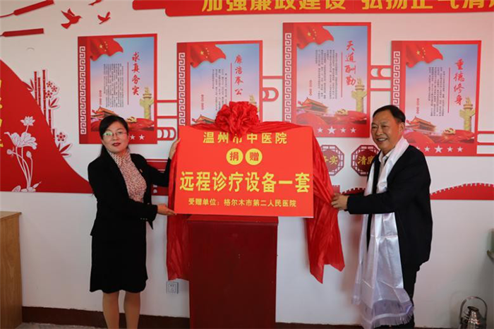 院长朱文宗、3名帮扶专家,温州市人民医院党委副书记胡建峰、党政办主任缪一艇,格尔木市人民政府副市长张菊及领导班子、中层干部参加了捐赠揭牌仪式。